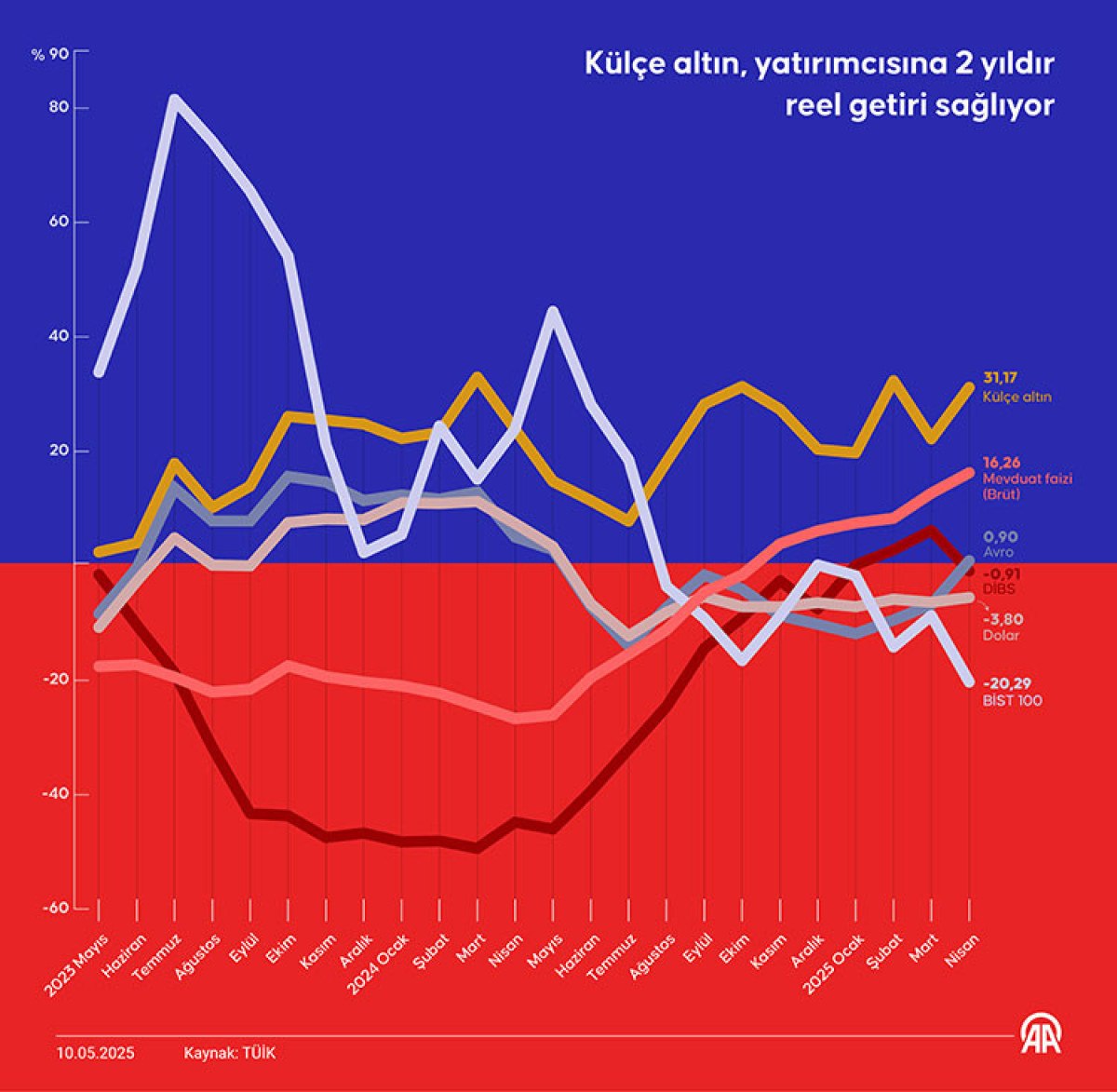 TÜİK tarafından incelenen finansal yatırım araçları arasında külçe altının diğerlerinden ayrılması dikkat çekici oldu. Nisan itibarıyla Yİ-ÜFE ile indirgendiğinde külçe altın %31,17 reel getiri sağlarken mevduat faizi %16,26 ve euro %0,90 oranında kazandırdı.